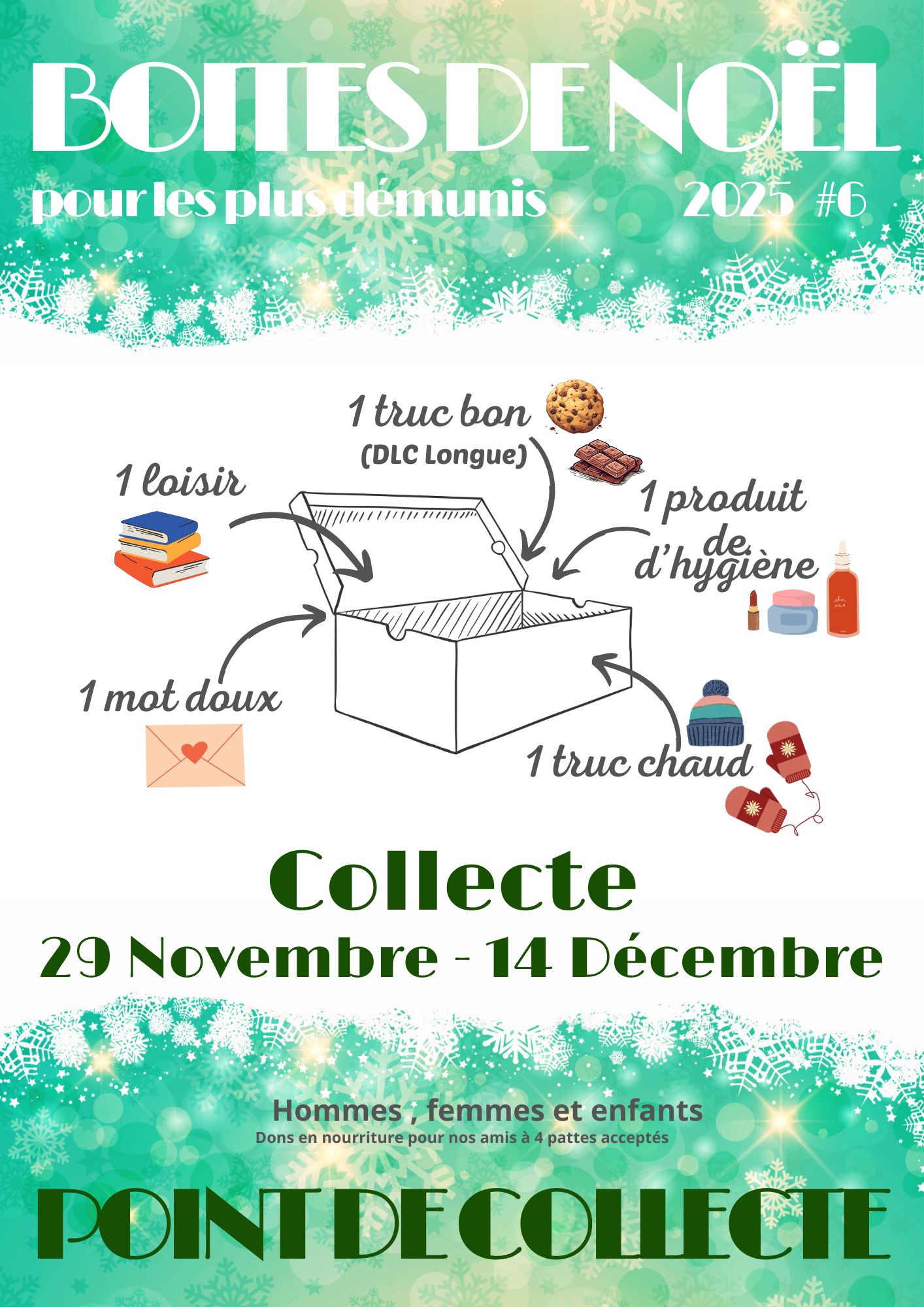 Du lundi 1er au vendredi 14 décembre 2025, déposez vos dons directement à la mairie.